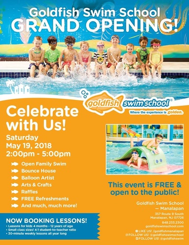 What: Grand Opening Celebration at Goldfish Swim School Manalapan When: Saturday, May 19, 2018 from 2pm - 5pm Where: 357 Route 9 South, Manalapan, NJ 07726 - Goldfish Swim School Manalapan Details: Join us for a Grand Opening Celebration at Goldfish Swim School Manalapan. There will be open family swim, as well as a bounce house, balloon artist, arts & crafts, raffles, refreshments and much more. This event is FREE and all are welcome. For more information, please visit: https://www.goldfishswimschool.com/manalapan/events/
